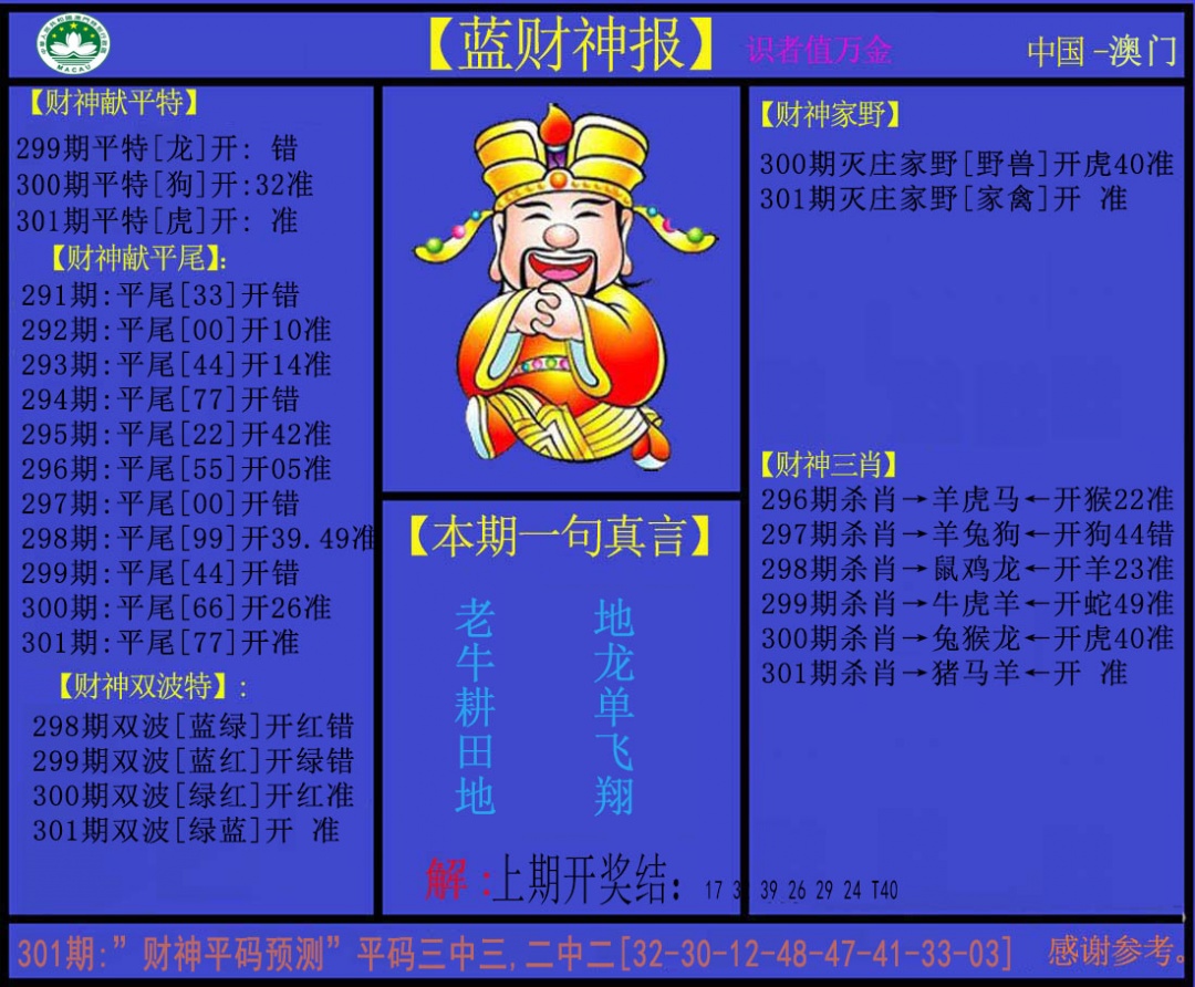 301期: 澳门六合皇彩圖信封【蓝财神报】每期自动更新